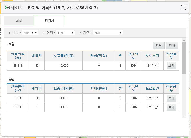 다음은 전월세에 관한 정보도 확인해 보겠습니다. 매매 탭 옆에 있는 전월세 탭을 누르면 바로 확인이 가능합니다. 매매든 전월세든 차트를 누르시면 월별로 확인이 가능하니 이점 참고하시기 바랍니다.