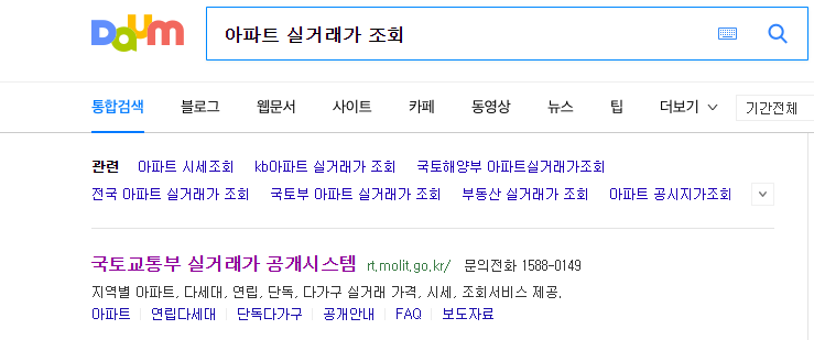 먼저 검색창에 아파트 실거래가 조회를 검색해 줍니다. 그러면 국토교통부 실거래가 공개시스템 사이트가 나옵니다.