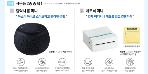 갤럭시 S20 사전예약을 했을 때 주는 세 번째 혜택은 '갤럭시 홈미니'와 '네모닉 미니 프린터' 중 하나를 선택하는 것입니다. 스마트폰과 연동되어 여러 가지 서비스가 가능한 갤럭시 홈미니 또는 스마트폰으로 바로 출력이 가능한 네모닉 프린터중 하나를 선택하시면 됩니다.