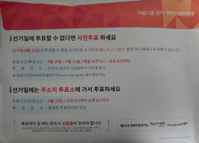 이러한 국민의 권리를 지킬 때 정치인들도 더 열심히 할 것이기에 꼭 투표를 하시기 바랍니다. 투표 당일에 어려울 것 같다면 꼭 사전에 꼭 실시하시기를 권고하는 바입니다.