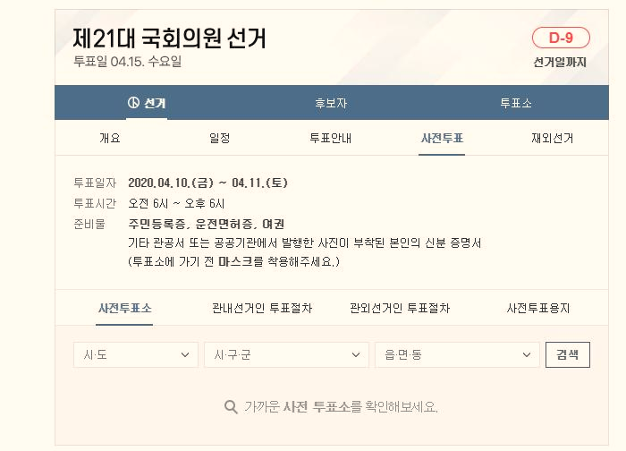 그러므로 이번 제21대 국회의원 선거의 사전투표일은 04.10(금)~04.11(토)이며 시간은 동일하게06:00am ~ 06:00pm입니다.