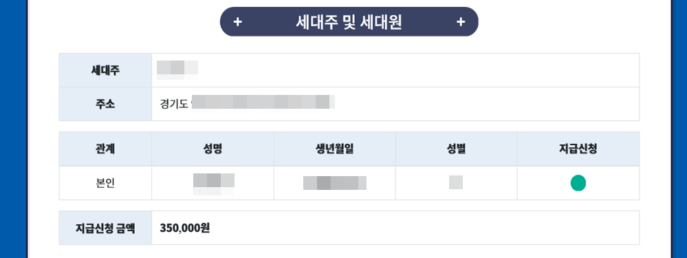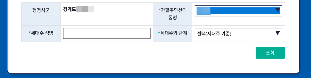 이제 마지막 절차만 남았는데요. 자신의 관할주민센터 동명을 입력하고 세대주 성명과 세대주와의 관계를 선택해주면 됩니다. 저는 현재 혼자 살고 있으므로 세대주는 제 이름이고 세대주와의 관계는 본인으로 했습니다.