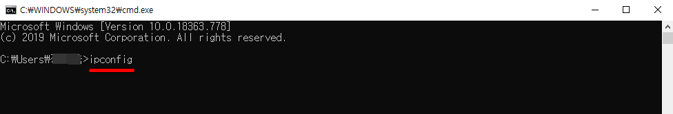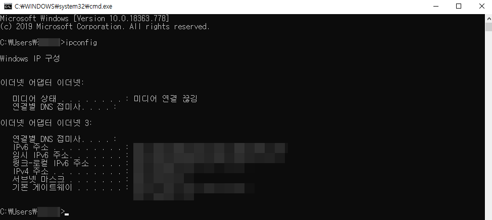 그럼 까만 배경에 도스 같은 창이 뜨는데요. 바로 “ipconfig”를 입력하고 엔터를 눌러줍니다. 그럼 아래 사진과 같이 바로 확인이 가능합니다.