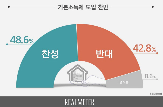 이러한 상황가운데, 리얼미터는 기본소득제에 대한 찬반 조사를 실시했는데요. 굉장히 팽팽한 접전을 보여주었습니다. 응답자의 48.6%가 최소한의 생계 보장을 위해 찬성한다고 했으며, 42.8%는 국가 재정에 부담이 되고 세금이 늘어난다는 이유로 반대를 했습니다. 잘 모른다고 대답한 응답자는 8.6%입니다.
